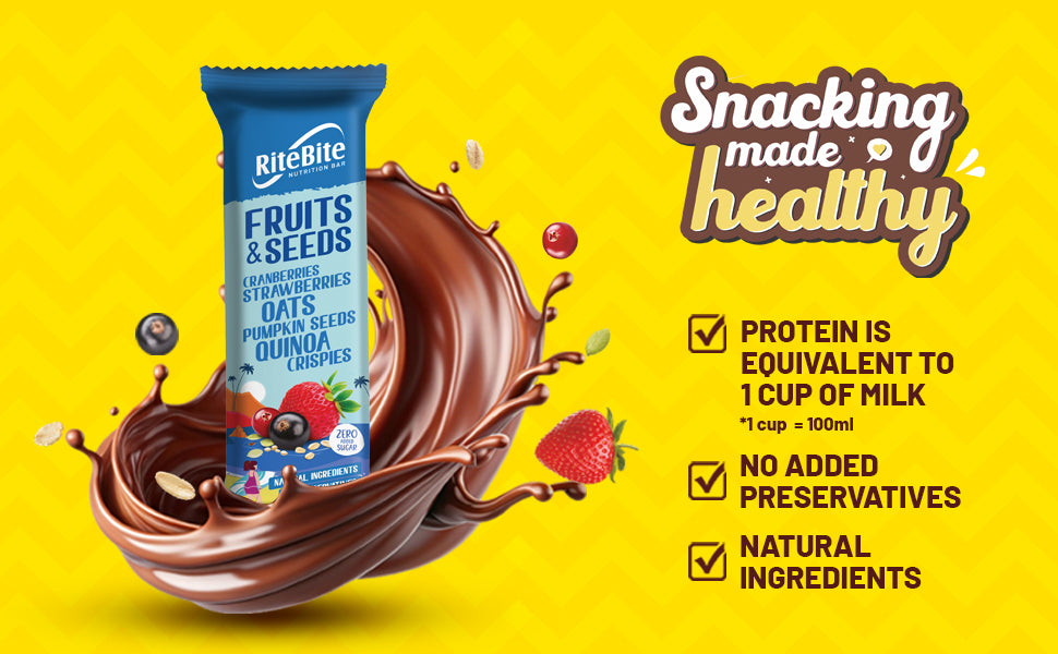 RiteBite Fruits & Seeds Bar features almonds, cashews, pumpkin seeds, chia, and flaxseeds to provide fiber, good fats, and lasting fullness. Enjoy it as a post-lunch digestive snack, pre-gym fuel, or an on-the-go option during long travel days.