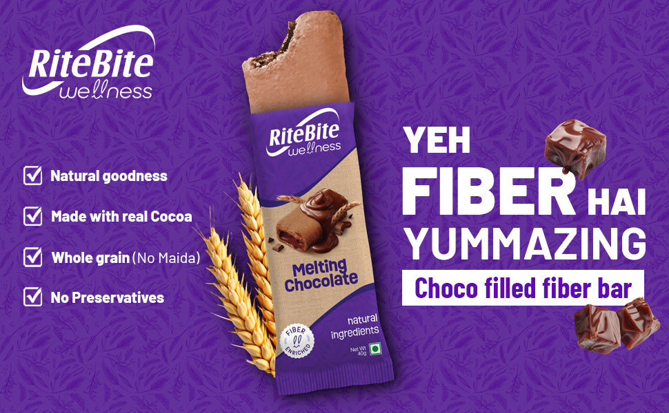 RiteBite Wellness Melting Chocolate bar combines rich cocoa flavor with the fiber benefits of whole grains, helping you curb hunger and satisfy chocolate cravings in a healthier way. Free from maida, transfats, and preservatives, this bar provides a guilt-free chocolate indulgence while delivering essential nutrients to support a balanced diet. Perfect for satisfying chocolate cravings between meals or after workouts, offering a delicious, energy-packed snack that supports digestive health.